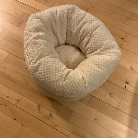 Kattepude i gråt ydre stof med cremefarvet, blødt indvendigt materiale. Designet til at give komfort og varme til katte