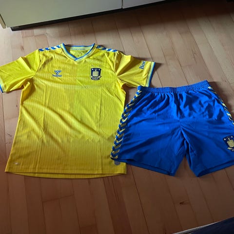 Hummel AGGER fodboldtrøje og shorts i størrelse M til mænd. Trøjen er gul med blå detaljer og har nummer 22 på ryggen. Shortsene er blå med gule detaljer. Sættet er designet til fodboldbrug.