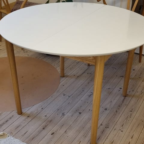 IKEA udtræksbord i træ med rund bordplade. Bordet har en naturlig træoverflade og fire ben. Velegnet til spisestuen eller køkkenet til daglig brug. Bordet leveres med 4 stole fra Jysk.