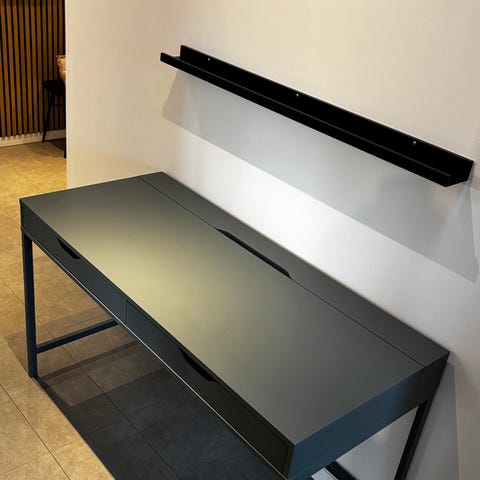IKEA Alex skrivebord i blå farve med patina fra slitage, fuldt funktkionelt se billeder. Designet med en enkel og funktionel stil, egnet til brug som arbejdsbord eller skrivebord i hjemmet eller kontoret se modelbillede. Kan efter aftale leveres i København.