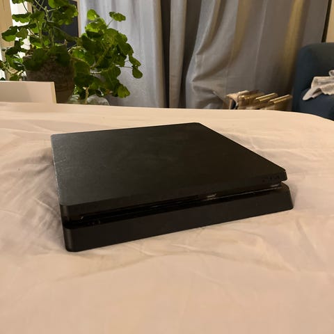 Sony Playstation 4 spillekonsol i sort. Konsollen er designet til gaming og underholdning, og fungerer upåklageligt.