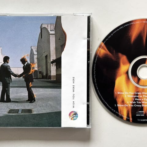 Pink Floyd-albummet "Wish You Were Here". Udgivet i 1975, er det et af bandets mest ikoniske værker. Albumcoveret viser to mænd, der giver hånd, hvoraf den ene er i brand, hvilket symboliserer frygt for at blive "brændt" i musikbranchen. Det inkluderer den berømte sang "Shine On You Crazy Diamond", en hyldest til tidligere bandmedlem Syd Barrett. Albummet er kendt for sine temaer om fravær, isolation og musikkens mekanik. God stand, dog er der lidt knas på nummeret "Wish You Were Here"!