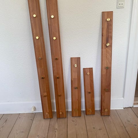 Meget fin knagerække i eg med knager i messing. Købt hos det nu konkursramte Werenberg. Derfor kan jeg ikke henvise til en bestemt model.