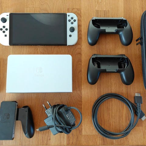Original oplader, dock til fjernsyn og grip til at samle Joy Cons medfølger