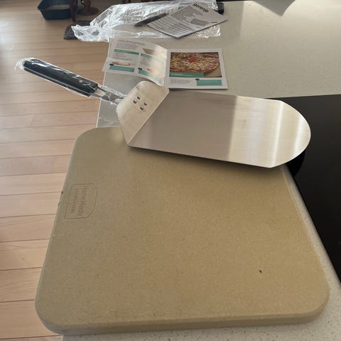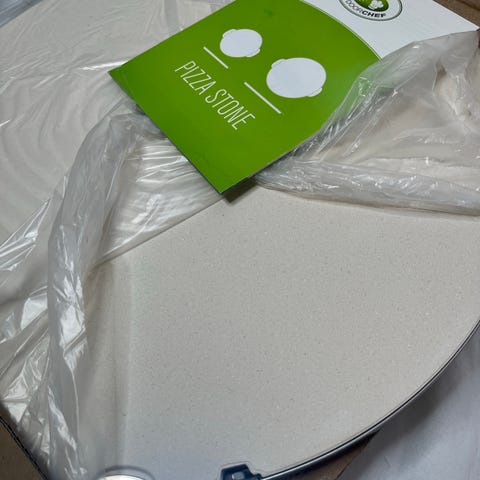 Pizzasten rund med en diameter på 33 cm i beige farve. Materialet er ikke specificeret. Anvendes til bagning af pizza og andre bagværk for at opnå en sprød bund.
