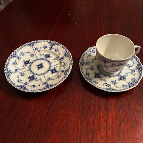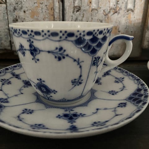 Stor kurv med gamle kaffe og tekopper, underkopper og kagetallerkener sælges samlet for højstbydende