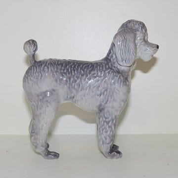 Royal Copenhagen figur af puddel, glaseret. I 2008 lancerede Royal Copenhagen flere af de kendte figurer i helt hvid, deriblandt denne Royal Copenhagen figur af puddelhund, som oprindeligt blev designet af Jeanne Grut.