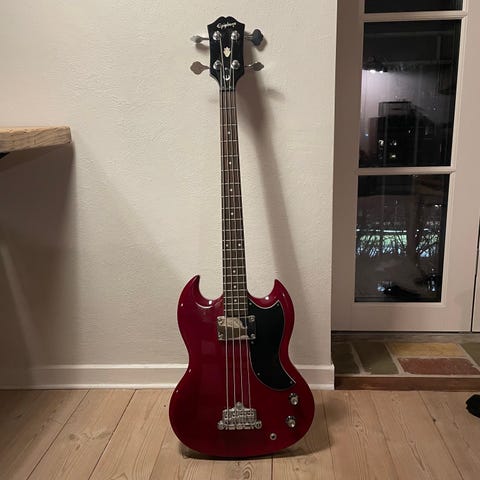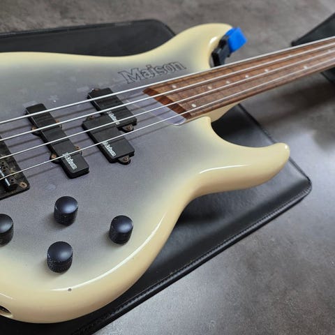 Maison bas guitar med naturfarvet træfinish. Fire strenge med justerbare stemmeskruer og kontrolknapper til lydindstilling. Instrumentet har en solid krop og hals med integrerede elektronikkomponenter.
