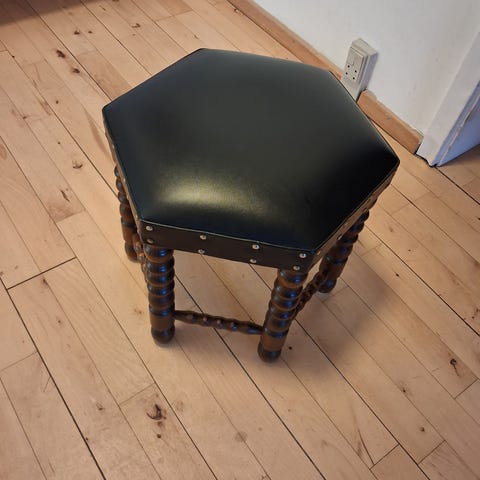 Fremstår som ny. Læderovertræk. Højde 45 cm, bredde 38 cm , længde 55 cm. Understellet er forkromet stål.