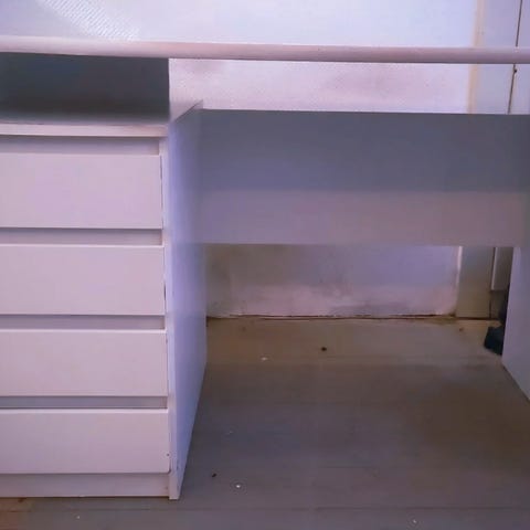Skrivebord / gamerbord i hvid laminat med 4 ben og hul til ledninger