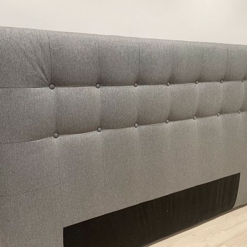 Senge gavl med polstret hovedgærde i gråt stof. Hovedgærdet har knapdetaljer og er beklædt med gråt tekstilmateriale. Senge gavl er velegnet til soveværelse og kan kombineres med forskellige madrasser og sengebunde.