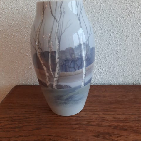 Bing & Grøndahl vase med landskabsmotiv, fremstillet i porcelæn. Vasen har en glat, hvid overflade med malet motiv af birketræer og landskab i afdæmpede farver. Produktet er dekoreret med Bing & Grøndahls mærke og serienummer under bunden. Ca 25 cm. Høj.