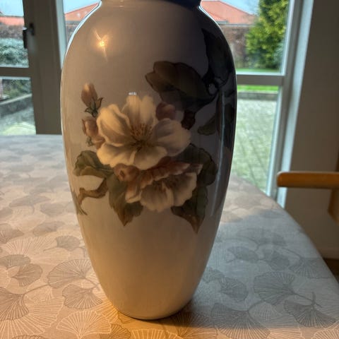 Bing & Grøndahl vase i porcelæn med håndmalet blomsterdekor. Vasen har en klassisk form og er dekoreret med naturtro blomster i blå og hvide nuancer. Ca 19,5 cm høj.
