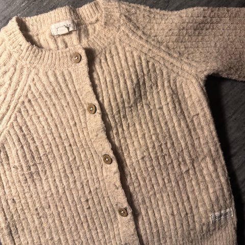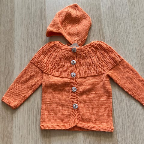 Strik cardigan og strikhue i økologisk baby alpaka. Blød og glat fornemmelse på huden. Cardiganen mangler en lille kokos-knap, ellers er alt fint.