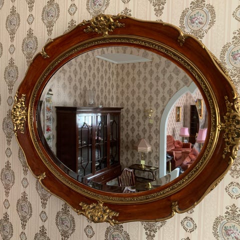 Antikt spejl med en træramme malet i grøn og beige farve. Spejlet har et klassisk design med dekorative detaljer på rammen. Velegnet til brug som vægspejl i hjemmet.