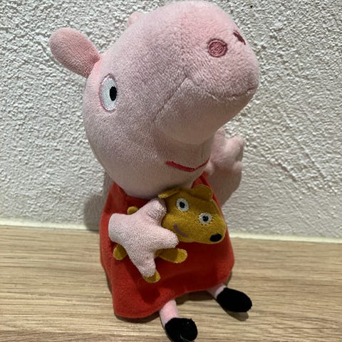 Hun er i blødt materiale med rød kjole. Bamsefiguren Gurli Gris måler ca 20 cm i højden.