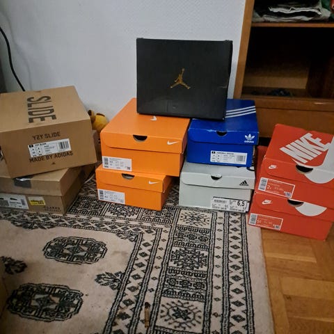 13 fede sneaker boxe . Bokse til sneakers - kasser til sko med låge du åbner foran. Min søn har haft både sko men også parfumer og meget andet i Display i dem. Men pladsen på hans værelse er trang så nu skal de videre. 2 af dem har desværre fået en revne (se billeder) resten er fine men kunne godt bruge at blive “pudset” / tørret med en fugtig klud