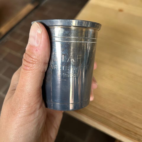 "Ove C. Bjerregaard" 24 vippemålebæger (også kendt som en jigger eller et centilitermål), som ofte bruges til at måle spiritus til drinks. Lignende produkter sælges af firmaet Ove C. Bjerregaard A/S, som er leverandør af industri- og storkøkkenudstyr.
