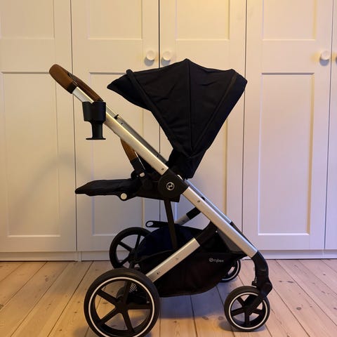 Cybex klapvogn med sort stof og brun læderhåndtag. Klapvognen har et stel i sølvfarve, justerbart håndtag og hjul med affjedring. Er brugt og har brugsspor, som fremgår på billederne. Regnslag i beige medfølger.