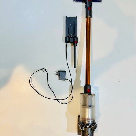 Dyson Cyclone V10 Absolute støvsuger med trådløs funktionalitet. Farve: Orange. Inkluderer flere mundstykker og oplader samt vægophæng. Designet til effektiv rengøring af forskellige gulvtyper.