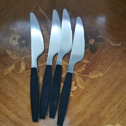 Georg Jensen Strata, design Henning Koppel teske, 18 stk. Skeerne er lavet af stål med grønne /petroleum plastik håndtag.