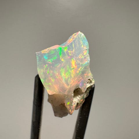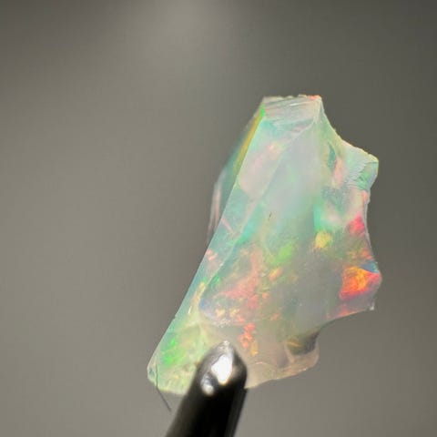 Rå opal med klar til let mælket krop og meget kraftigt farvespil. Stenen viser tydelige felter af grøn, gul og rød som ligger i lag gennem materialet og bliver stærkere når den bevæges i lyset. Den øverste del er mere ren og transparent mens den nederste del har bevaret naturlig matrix, hvilket giver et tydeligt indtryk af stenens oprindelige form. En flot etiopisk opal med stærke farver og god dybde.