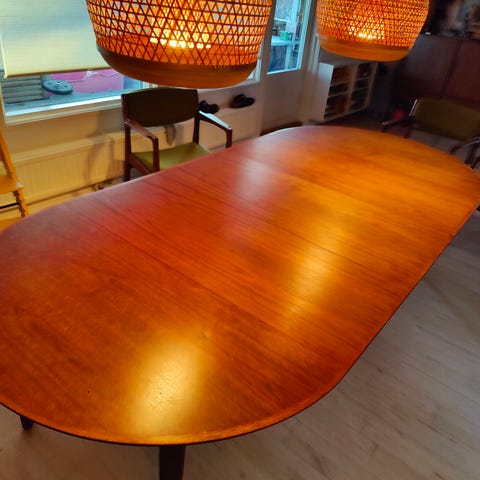 SOLGT Rundt teakbord diameter 118 cm, ikke massivt teak, med to pæne indlægplader af 50 cm hver (50 x 118). Kan blive 218 cm langt. Med 1 indlægsplade passer det til 4-6 personer. Stabilt og solidt bord. Har skader og enkelte steder gennemslibninger på bordpladen, men fremstår som et teakbord med charme og rigtig god brugsværdi. Pæn farve. Rent og pænt. Oliebehandlet. Skal hentes i 3210 Vejby.