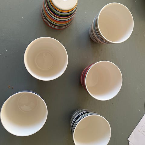 Iittala kopper med stribet mønster i forskellige farver. Kopperne er lavet af porcelæn og velegnede til daglig brug i køkkenet eller til servering.