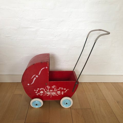Antik BRIO dukkevogn, ca. 35 år gammel. Lyserød. Kalechen er falmet, bunden er ikke original, men er en tilpasset træplade og elastikken i de små sorte holdere på overdækket er blevet slappe med tiden. Den har for det meste bare stået helt stille indenfor, men har nogle enkelte gange kørt på fliser udenfor. Der er ingen rust på stellet, og der medfølger en madras af vat, en pude og en dyne i det sødeste blomstrede stof. Den har været passet på og elsket i mange år, og den er derfor trods tidens tand i fin stand.