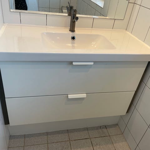 Kom og hent. Vi skal af med det. Ikea godmorgen med to skuffer i hvid samt matchende hvid vask og armatur. Møblet er velegnet til badeværelse og giver opbevaringsplads til toiletartikler. Materialet er holdbart og nemt at rengøre.