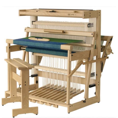 Ashford Standard væv i træ på gulvstativ med tilbehør, herunder klemmer og ekstra dele. Væven er velegnet til vævning af tekstiler og håndarbejde.