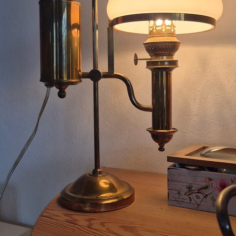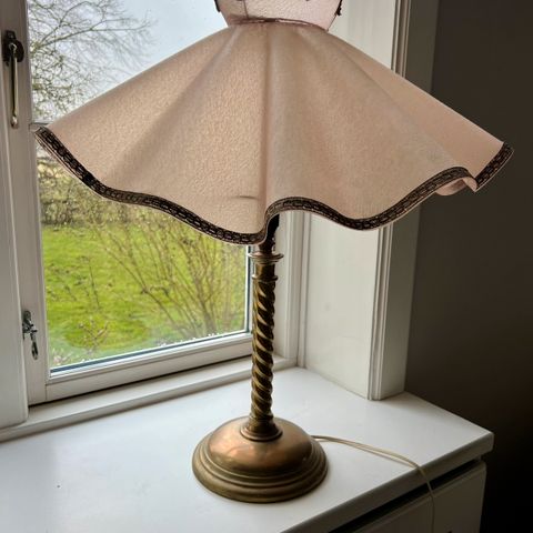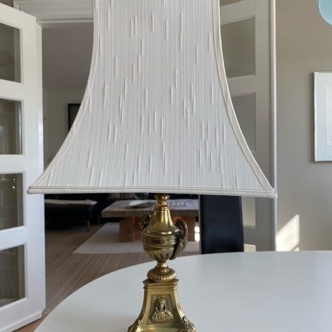 Antik messinglampe med hvid silkeskærm
