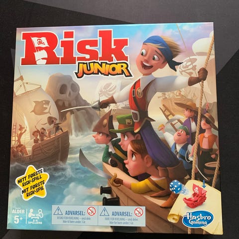 Hasbro Risk Junior brætspil med pirattema. Inkluderer spilleplade, spillebrikker og terninger. Egnet til børn fra 5 år og op. Spillet fremmer strategisk tænkning og er designet til juniorbrugere.