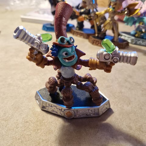 Skylanders figur med detaljeret design, der forestiller en karakter med en stor hammer. Figuren er fremstillet i plastik med sort og gyldent farvetema. Velegnet til samling eller brug med Skylanders-spil.