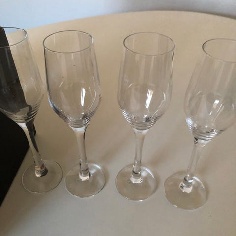 Sæt af Frederik Bagger Crispy Gatsby Champagne glas i farvet glas med graveret mønster. 3 lyserøde og 2 grønne. Original æske medfølger. Kun brugt 1 -2 gange. Glassene har en stilfuld form med bred skål og tynd stilk. Velegnet til servering af champagne, mousserende vine eller drinks. 320,- kr pr. stk. - ved køb af alle 5 glas, betales 300 kr pr. stk.