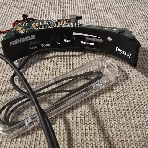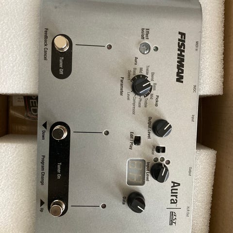 Fishman Tonedeq AFX Pre EQ DI guitarudstyr med flere kontrolknapper til justering af lydparametre. Enheden har en træramme og metalkontroller, designet til brug med guitarer.