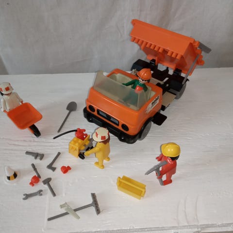 Vintage Playmobil bil med tilbehør, herunder værktøj og reservedele. Sjældent model . Bilen er gul med sorte og røde detaljer og indeholder flere ekstra dele til leg.