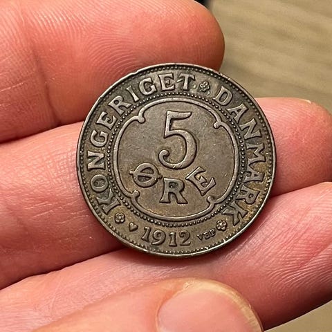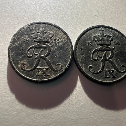 Danmark 5 øre mønt fra år 1960 med monogram og årstal. Mønten er lavet af metal og har en diameter på cirka 17 mm.