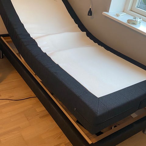Super fin og lækker Gold Dreamzone E40 elevationsseng 90x200 med tyk topmadras. Grå. 5 år gammel, men som ny. Alt virker som det skal.