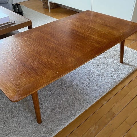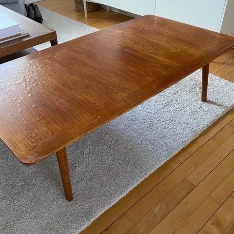 Bordet er meget slidt og har fugtskader og pletter ( se billeder) - men med en let slibning og en gang maling kan det måske blive flot igen.