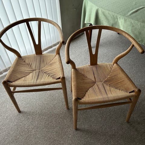 Y-stolene er cirka fem år gamle, men er ganske, ganske velholdte og fejler intet. Heller ikke i fletværket. Ingen pletter, skrammer, ridser og den slags. Til gengæld har træet den helt rette patina, som gør de klassiske danske designmøbler så meget smukkere.