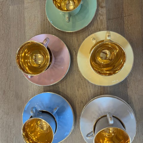 Fineste sæt med kop og underkop fra norske Figgjo Flint. Stellet hedder Margrethe. Jeg har to sæt; et mintfarvet og et grå/sand. Begge er guldfarvet indvendigt. Det grønne fremstår let krakeleret i overfladen men begge sæt er intakte og uden skår. Måske dine nye espressokopper?