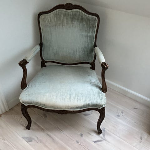 To antikke lænestole med træramme og polstret sæde og ryg i mønstret stof. Den ene stol har røde og beige striber, den anden grønne og beige striber. Begge stole har udskårne trædetaljer og buet rygstøtte.