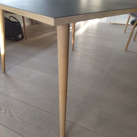 Flot spisebord med sort linoleumsbordplade og 4 stole i egetræ med sort kunstlæder. Bordpladen er slidstærk og nem at vedligeholde. Klassisk og stilrent sæt i god stand.