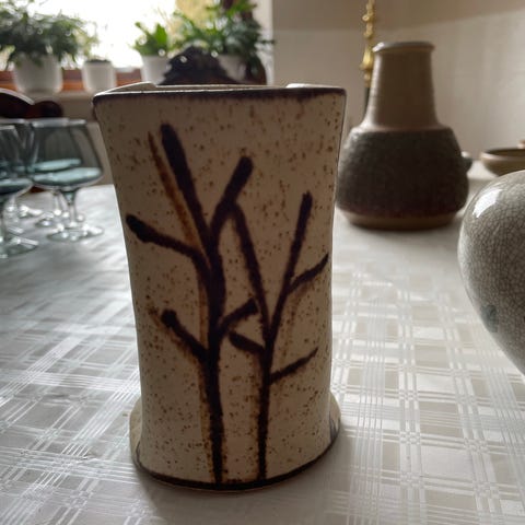 Vase i hånddrejet stentøj af Gerda Østergaard. Meget smuk, rødlilla glasur.