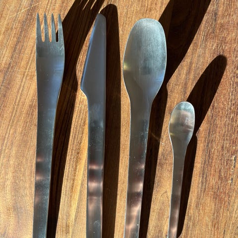 Stelton bestik design Erik Magnussen. 48 dele: knive, gafler, spiseskeer, dessertskeer. Derudover seks kagegafler, en drinksmåler, samt coasters og to fyrfadslysestager.