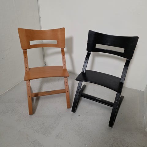 2 Leander Børnestole i sort træ. Designet til børn med fokus på funktionalitet og ergonomi. Stolen har en buet siddeplade og ryglæn for støtte. Velegnet til brug ved spisebord eller skrivebord.