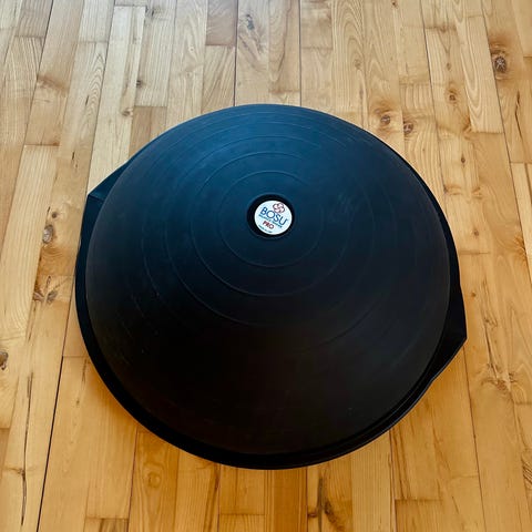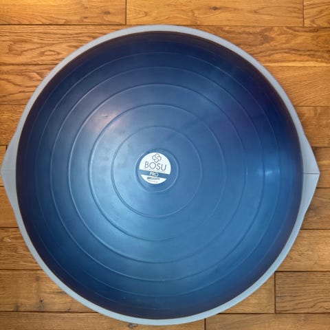 BOSU Balance Trainer halvkugle i blå farve. Produktet bruges til balance- og styrketræning og består af en oppustelig halvkugle monteret på en sort base.