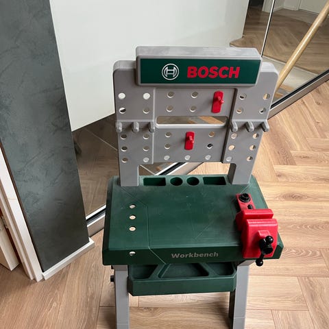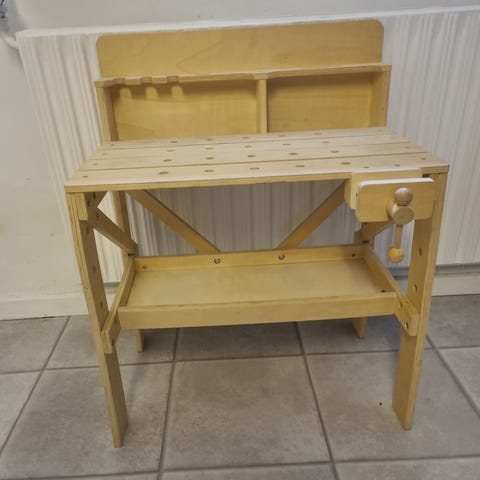 Arbejdsbord/værksted i træ til børn fra Kids Concept. Sættet indeholder en arbejdsbænk med forskellige værktøjer og tilbehør.