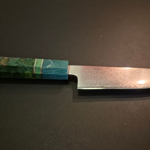 Blad 21 cm 67 lag damaskus blad, med kernestål af japansk VG10 med en hårdhed på 60 -62 hrc bladet er 46 mm højt.